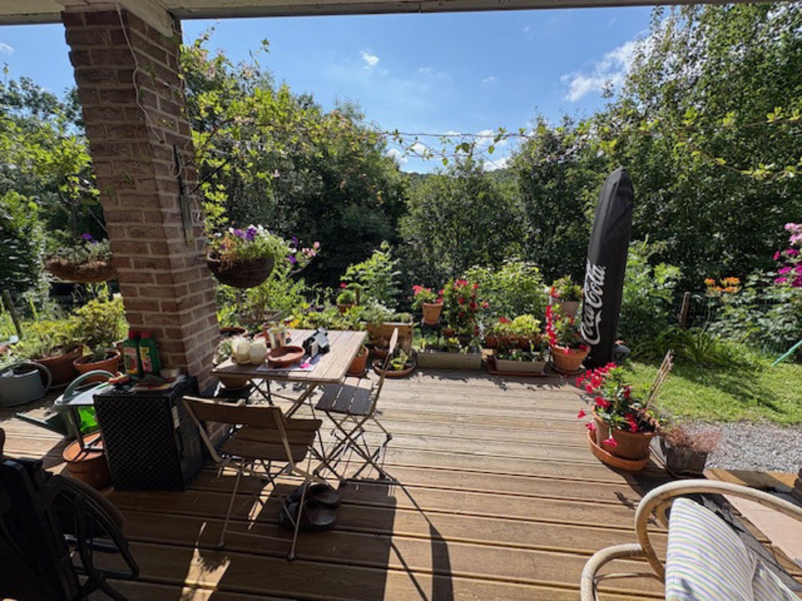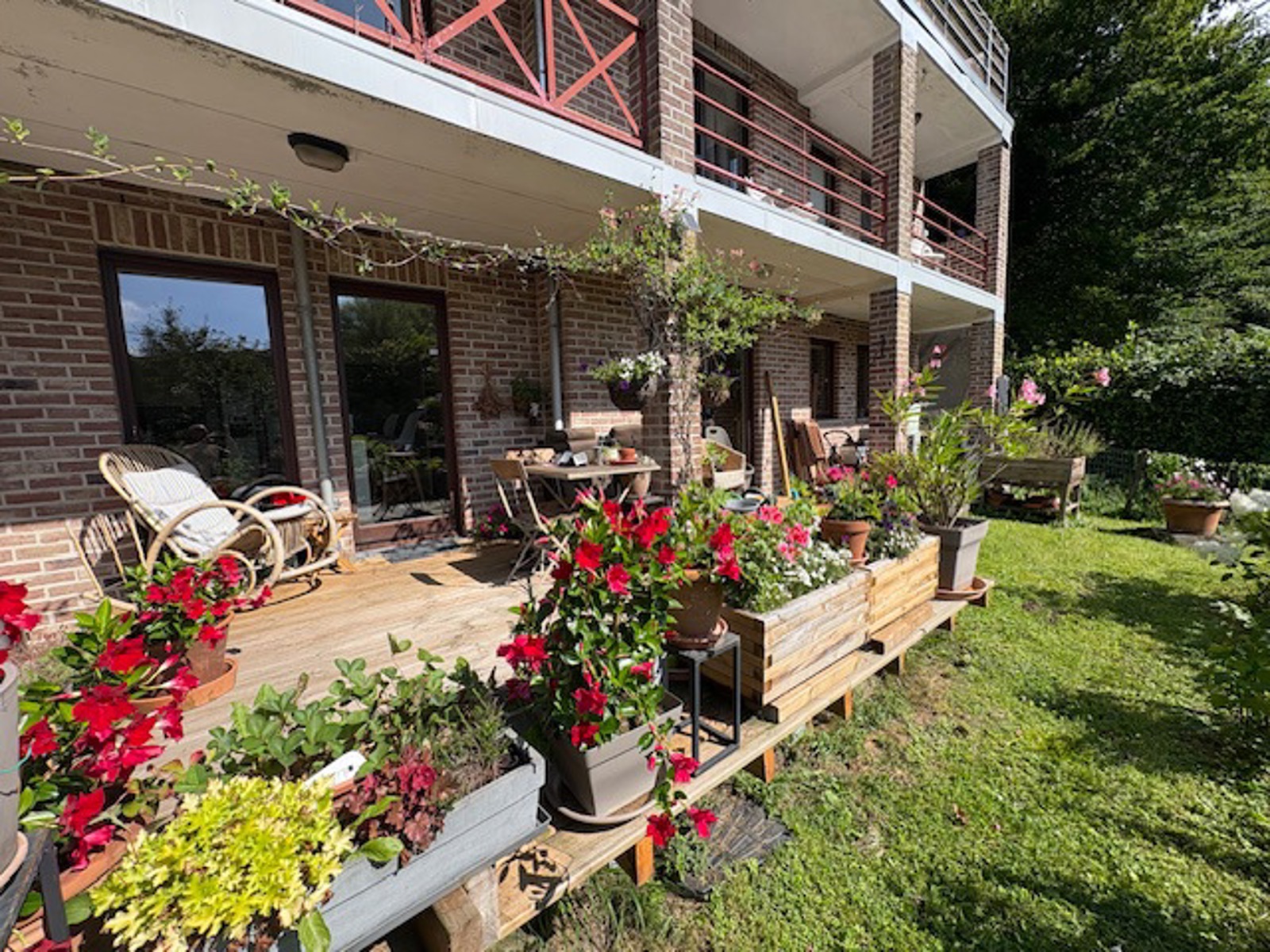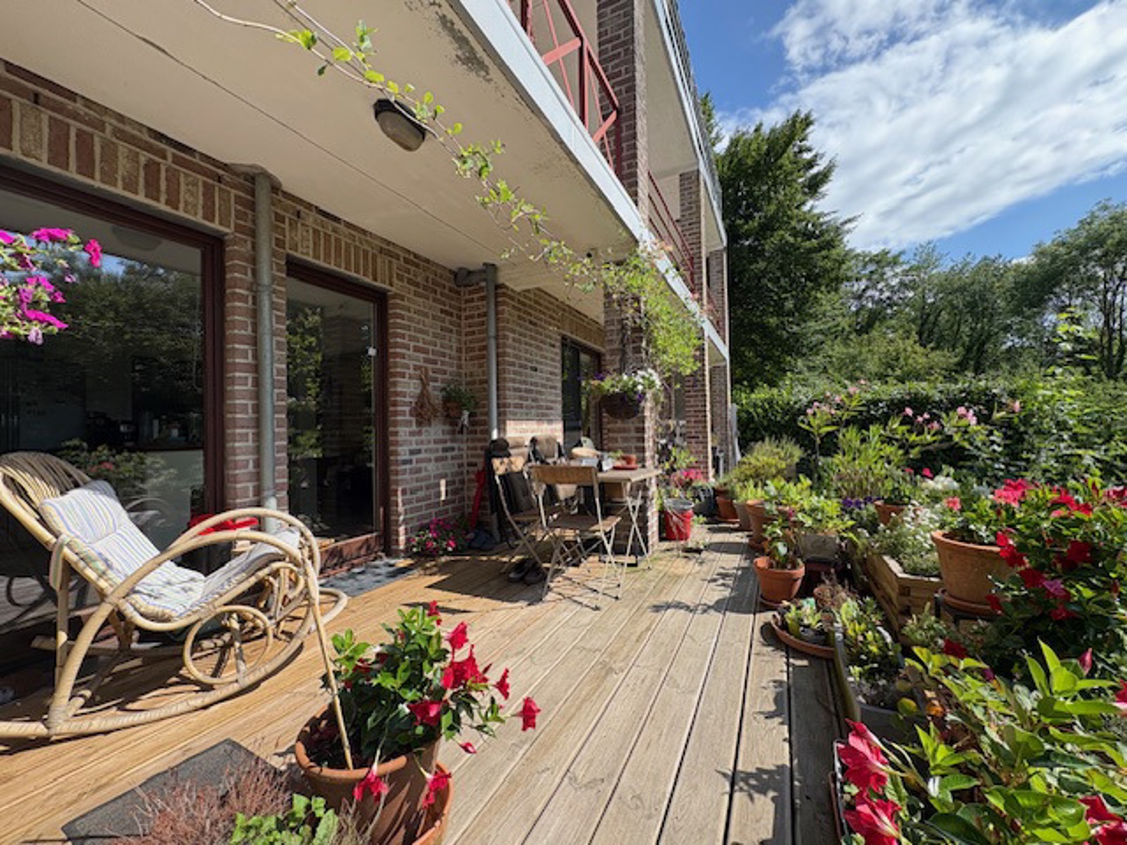La terrasse et le jardin longent l'appartement avec accès par les portes vitrées.